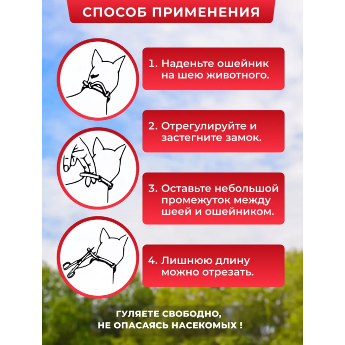 Открыть прозрачную упаковку перед использованием. Ленту ошейника завести в пряжку так, чтобы он свободно двигался на шее. Лишнюю длину срезать. Для растущего щенка оставить 1 - 2 см. длины.