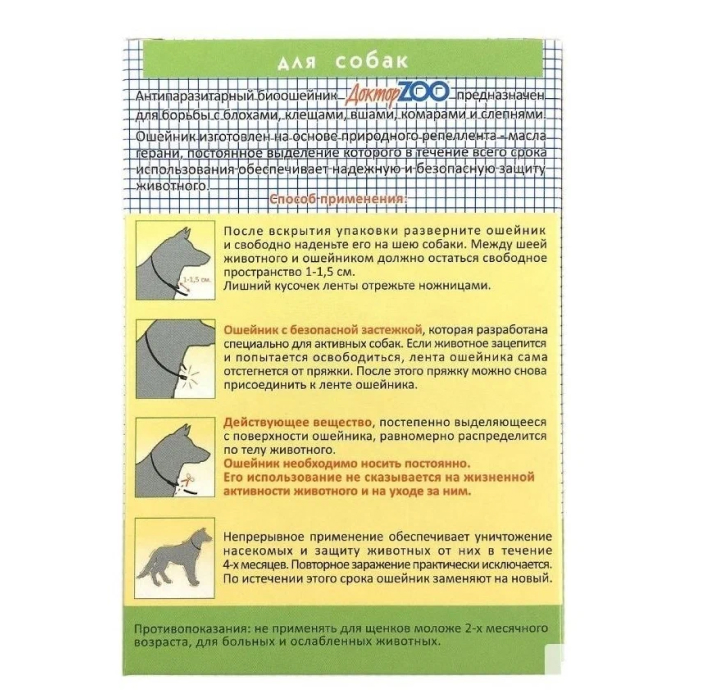 Антипаразитарный ошейник ДокторZOO предназначен для борьбы с блохами, клещами, вшами и власоедами.