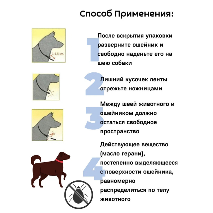 Ошейник изготовлен на основе природного репеллента – масла герани, постоянное выделение которого в течение всего срока использования обеспечивает надежную и безопасную защиту животного