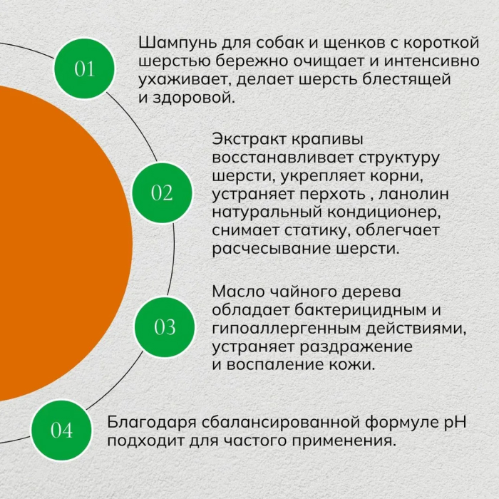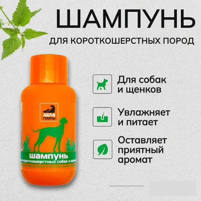 Шампунь Айда гулять для короткошёрстных собак и щенков предназначен для гигиенического ухода за шерстным и кожным покровом домашних животных: очищения от различных загрязнений, улучшения внешнего вида шерсти, снятия раздражения чувствительной кожи и устранения неприятного запаха.