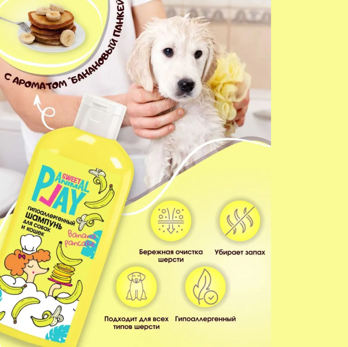 Шампунь увлажняющий для собак «БАНАНОВЫЙ ПАНКЕЙК». Натуральная косметика с восхитительными ароматами изысканных десертов!