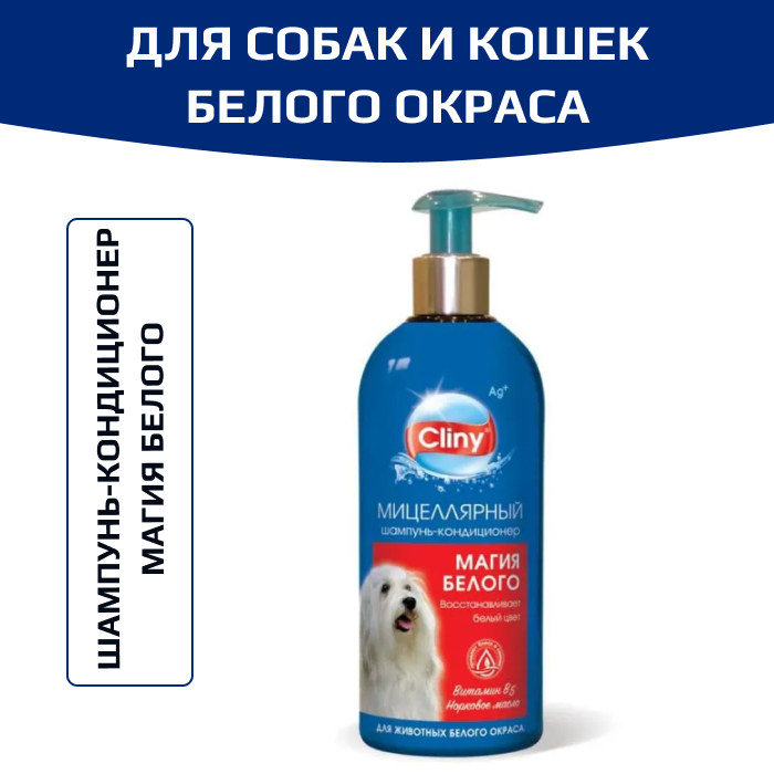 Cliny шампунь-кондиционер разработан для ухода за домашними питомцами с белым цветом шерсти. Подходит собакам, кошкам, кроликам.