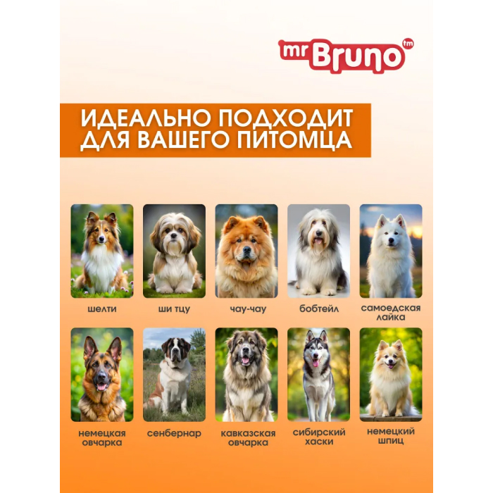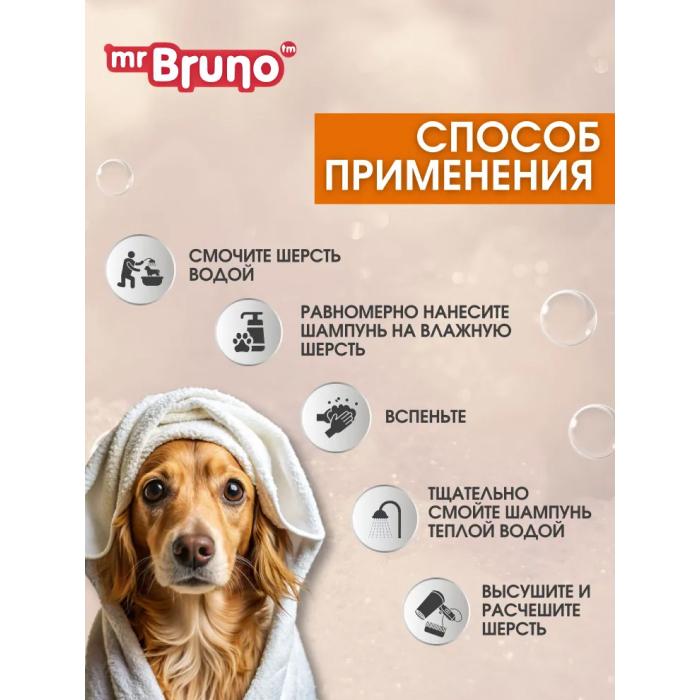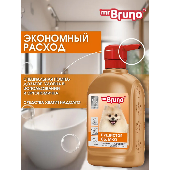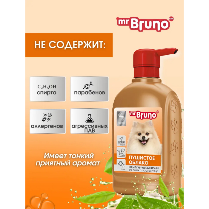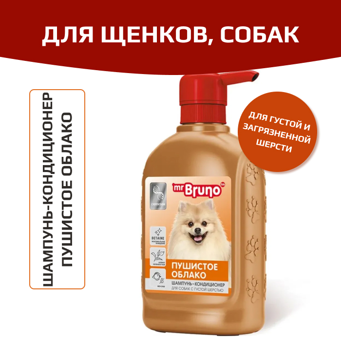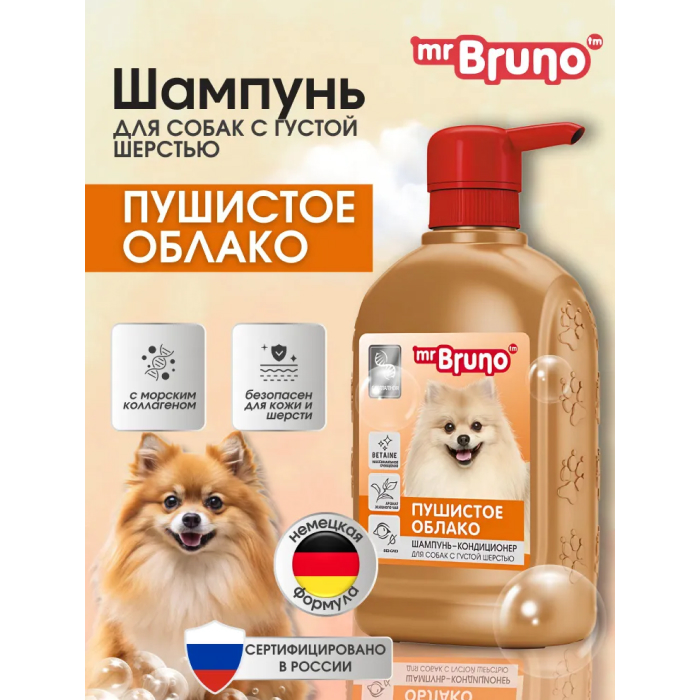 Mr.Bruno-Шампунь для собак Пушистое облако специально разработан для собак с густым подшерстком или с сильно загрязненной шерстью.