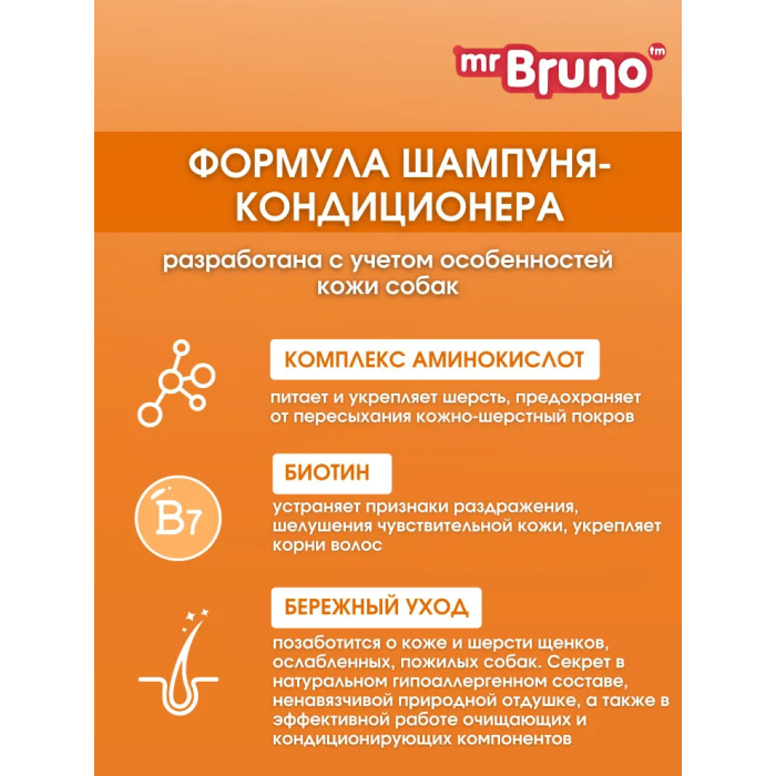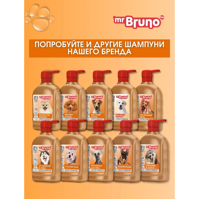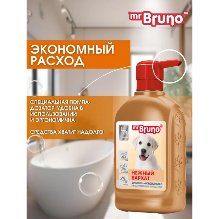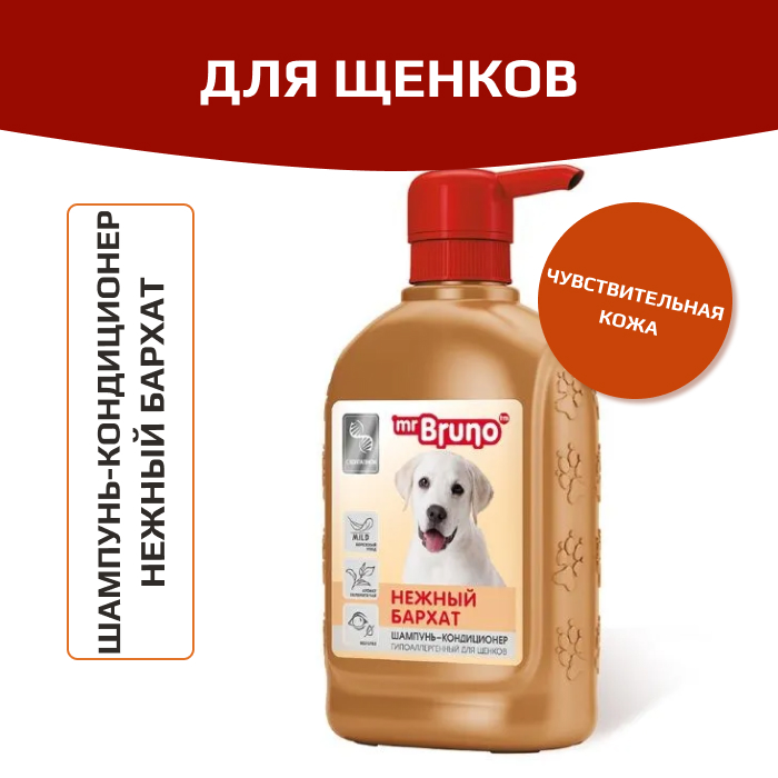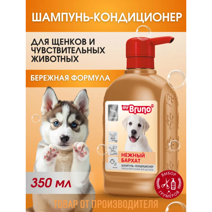 Шампунь Mr.Bruno-Шампунь для щенков Нежный бархат идеально подходит для щенков всех пород, а также склонных к аллергии, больных, ослабленных или стареющих животных. Рекомендуется также для мытья бесшерстных пород собак.