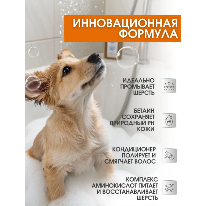 Мягкая формула шампуня бережно ухаживает за шерстью и кожей питомца: