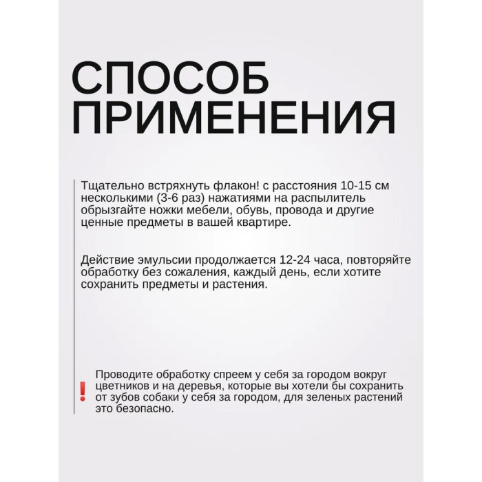 Тщательно встряхнуть флакон! С расстояния 10-15 см несколькими (3-6 раз) нажатиями на распылитель обрызгайте ножки мебели, обувь, провода и другие ценные предметы в Вашей квартире. Действие эмульсии продолжается 12-24 часа. Повторяйте обработку без сожаления, каждый день, если хотите сохранить предметы и растения. Проводите обработку спреем у себя за городом вокруг цветников и на деревья, которые Вы хотели бы сохранить от зубов собаки у себя за городом. Для зеленых растений это безопасно.
