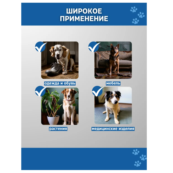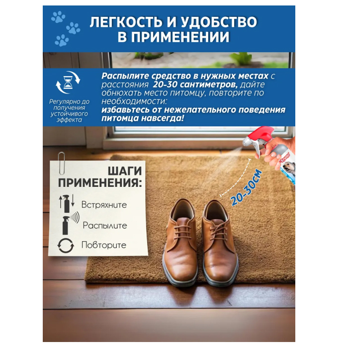 Встряхнуть флакон перед применением. Обработать спреем поверхности и предметы, которые необходимо защитить от животного. Для предотвращения поедания собакой инородных предметов на улице опрыскать спреем заинтересовавший животное предмет, не прикасаясь к нему руками. После этого рекомендуется гулять поблизости от приманки, чтобы собака наверняка обратила на неё внимание. Благодаря неприятному запаху и вкусу у собаки выработается условный рефлекс - не подбирать ничего на улице. Обработку рекомендуется повторять по мере необходимости, но не реже 1 раза в 3-4 дня до выработки у животного устойчивого рефлекса.