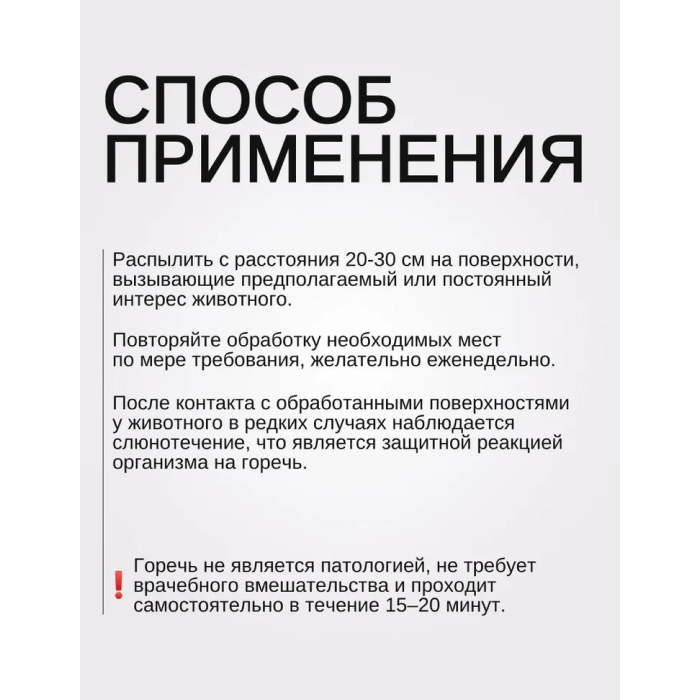 Распылить с расстояния 20 – 30 см на поверхности, вызывающие предполагаемый или постоянный интерес животного. Применять 1 – 2 раза в день, до достижения эффекта.