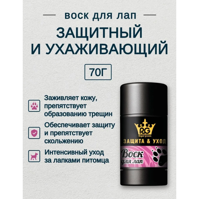 Роял Грум воск защита и уход применяют животным: перед прогулкой для защиты лап от воздействия факторов внешней среды (реагенты, нефтепродукты), на выставках для предотвращения скольжения на ринге, а также для увлажнения и питания ороговевших участков кожи: на подушечках лап и мозолях на локтевых сгибах.