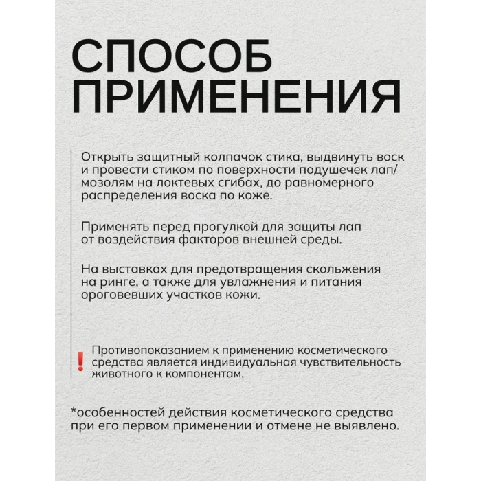 Противопоказанием к применению косметического средства является индивидуальная чувствительность животного к компонентам. Открыть защитный колпачок стика, выдвинуть воск и провести стиком по поверхности подушечек лап/мозолям на локтевых сгибах, до равномерного распределения воска по коже.