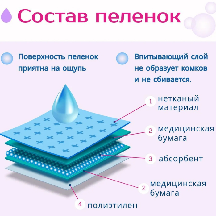Верхний слой: гипоаллергенный, мягкий, нетканный материал. Быстро впитывает влагу и надежно удерживает ее внутри.
