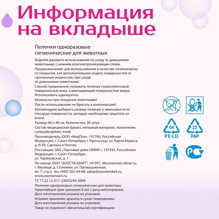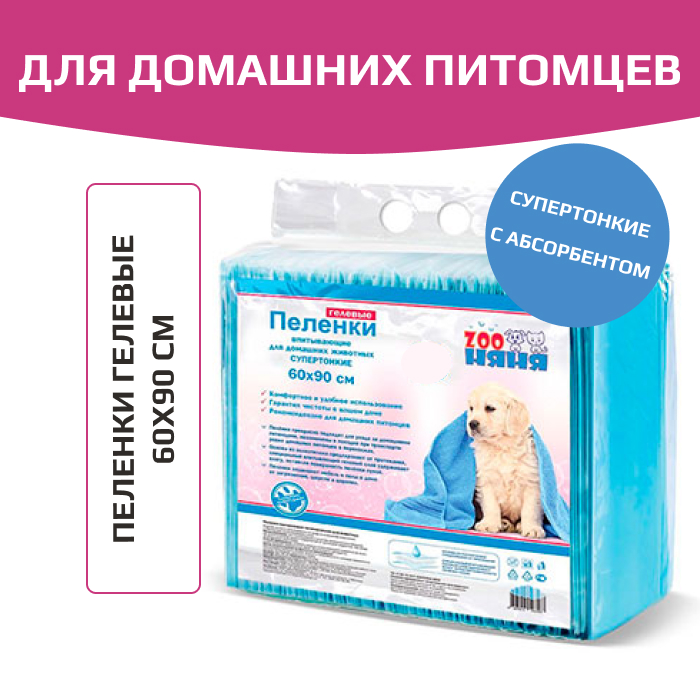 Пеленки ЗОО Няня предназначены для ухода за домашнимиживотными для приучения к туалетному лотку. Пеленки прекрасно впитывают влагу.Незаменимы в первые месяцы жизни щенков,котят,а также на выставках, приеме у ветеринара,после операций, в период лактации.