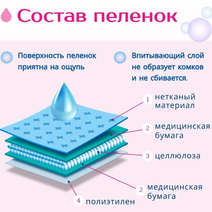 Верхний слой: гипоаллергенный, мягкий, нетканный материал. Быстро впитывает влагу и надежно удерживает ее внутри.