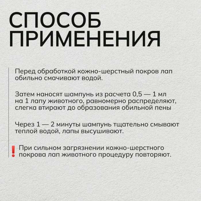 Перед обработкой кожно-шерстный покров лап обильно смачивают водой, затем наносят шампунь из расчета 0,5 — 1 мл на 1 лапу животного, равномерно распределяют, слегка втирают до образования обильной пены, избегая попадания на слизистые оболочки. Через 1 — 2 минуты шампунь тщательно смывают теплой водой, лапы высушивают. При сильном загрязнении кожно-шерстного покрова лап животного процедуру повторяют.
