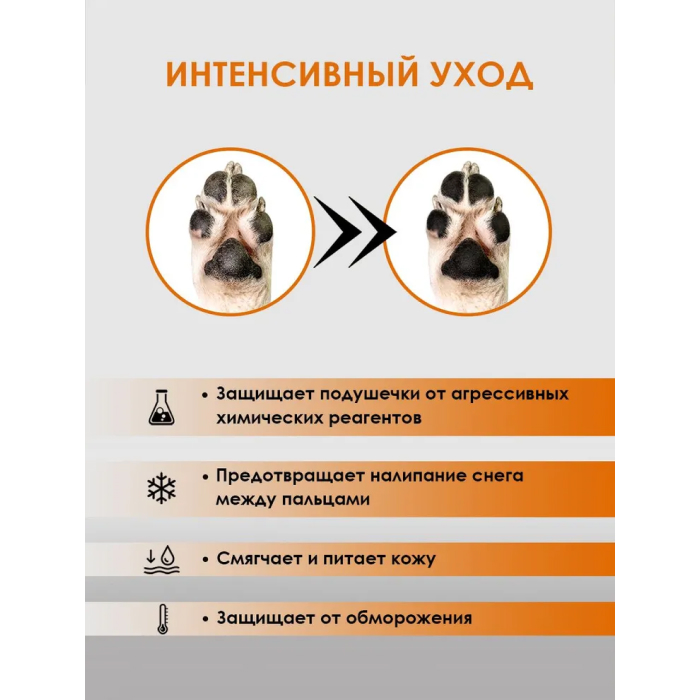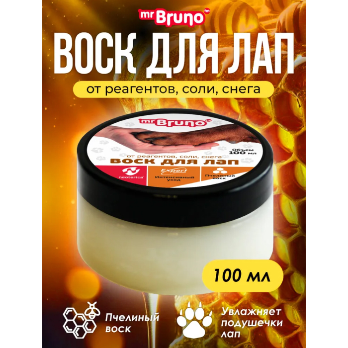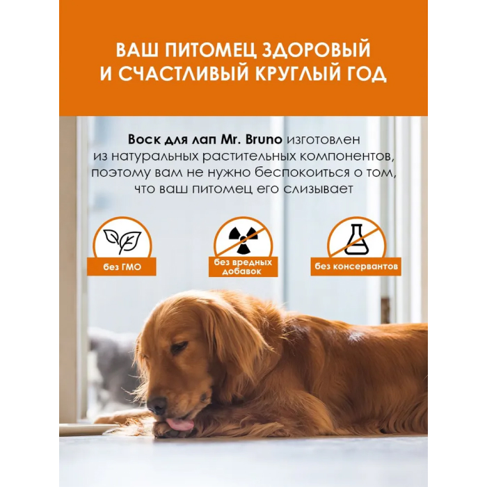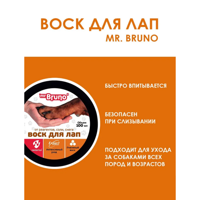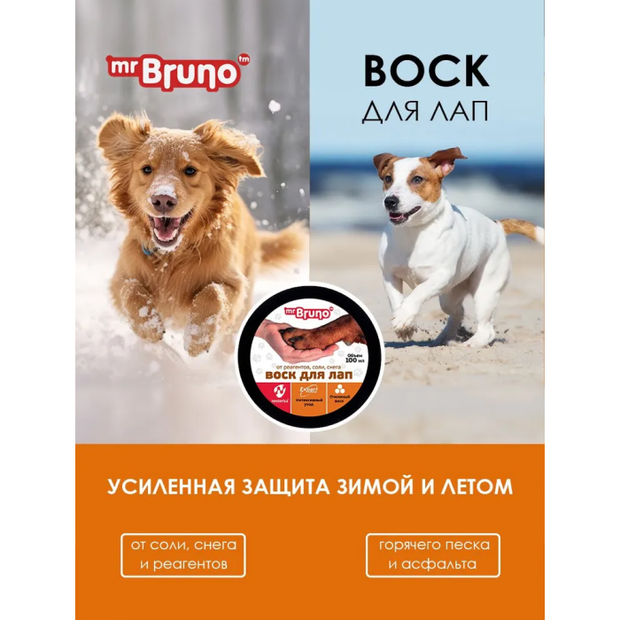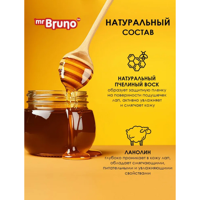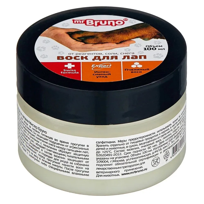 Вы не знаете, как защитить лапы любимого питомца от соли, снега и иных неблагоприятных факторов? Легко! Воск для лап Mr.Bruno эффективно защитит кожу лап от воздействия мороза, снега и различных противогололедных реагентов. Образуя на поверхности кожи толстую водонепроницаемую пленку, он препятствует обморожению и способствует уменьшению скольжения лап по льду. На прогулку в любую погоду с воском Mr.Bruno. Не является лекарственным средством.