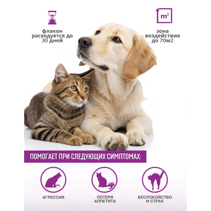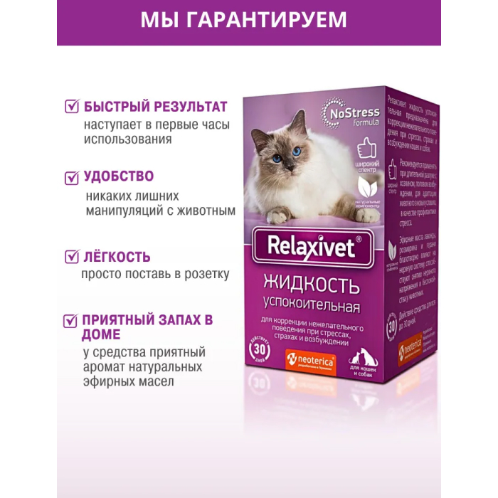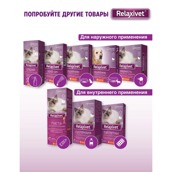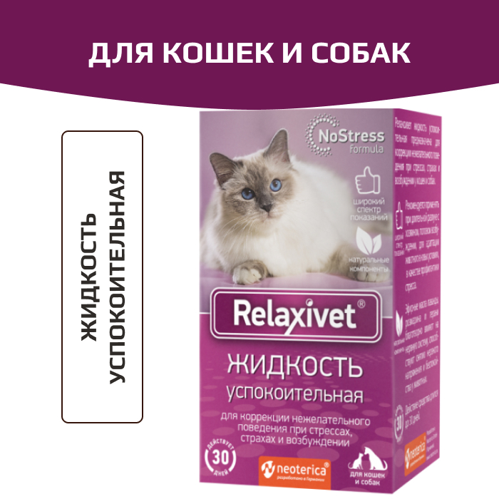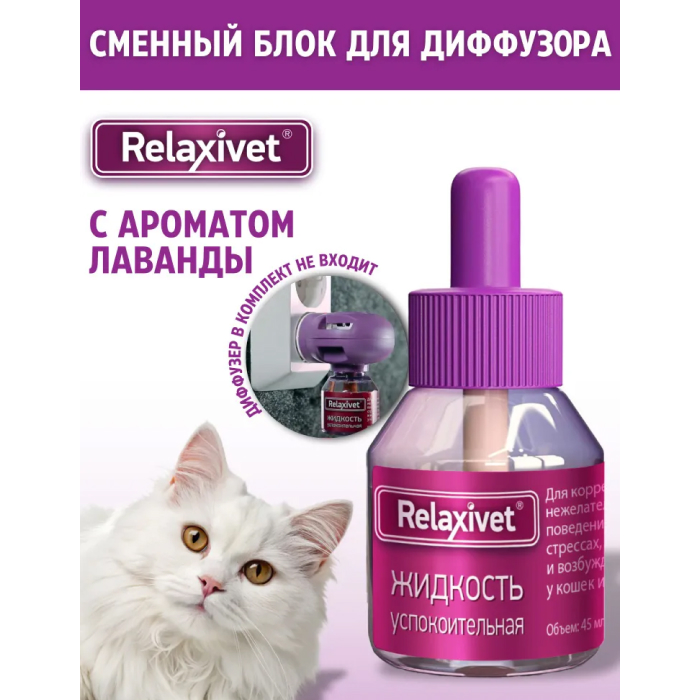 Relaxivet Сменный флакон для диффузора. Когда питомцы нервничают, они начинают плохо себя вести: постоянно мяукают или лают, портят мебель и оставляют метки, проявляют агрессию или пугливость. Решить проблемы и успокоить питомца помогут натуральные средства Relaxivet. Используйте Relaxivet кошкам и собакам для коррекции поведения, при стрессе, фобиях и возбуждении. Успокоительная жидкость Relaxivet благотворно влияет на нервную систему, способствует снятию нервного напряжения и беспокойства у животных, особенно при адаптации к новым местам или разлуке с хозяином.