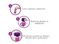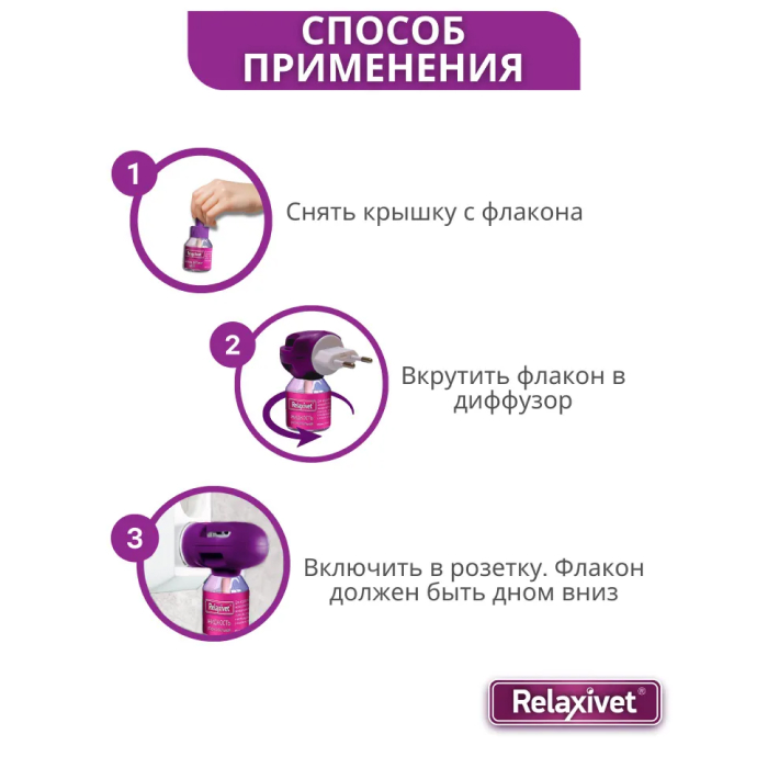 Снимите крышку с флакона Вставьте флакон в диффузор Relaxivet и закрутите до ощущения лёгкого сопротивления Собранный диффузор включите в розетку (220 В).
