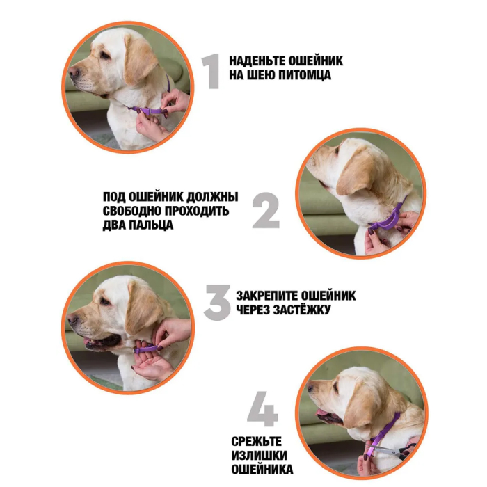 Свободно наденьте ошейник на животное, закрепите фиксатором, излишек ленты отрежьте. Длинна ошейника — 65 см. Состав разработан компанией Neoterica (Германия).