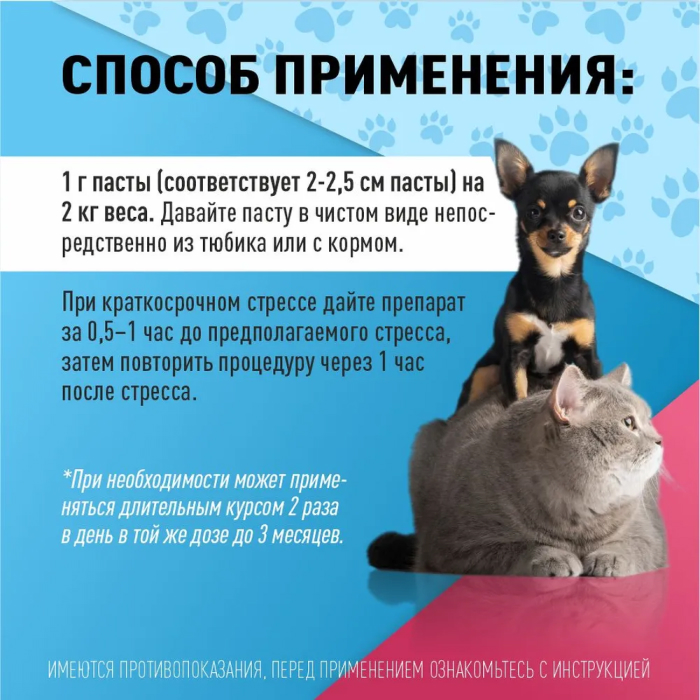 1 г пасты (соответствует 2-2,5 см пасты) на 2 кг веса Давайте пасту в чистом виде непосредственно из тюбика или с кормом. При краткосрочном стрессе дайте препарат за 0,5–1 час до предполагаемого стресса, затем повторить процедуру через 1 час после стресса. При необходимости может применяться длительным курсом 2 раза в день в той же дозе до 3 месяцев.
