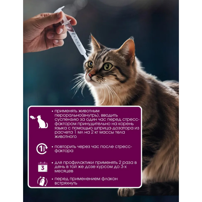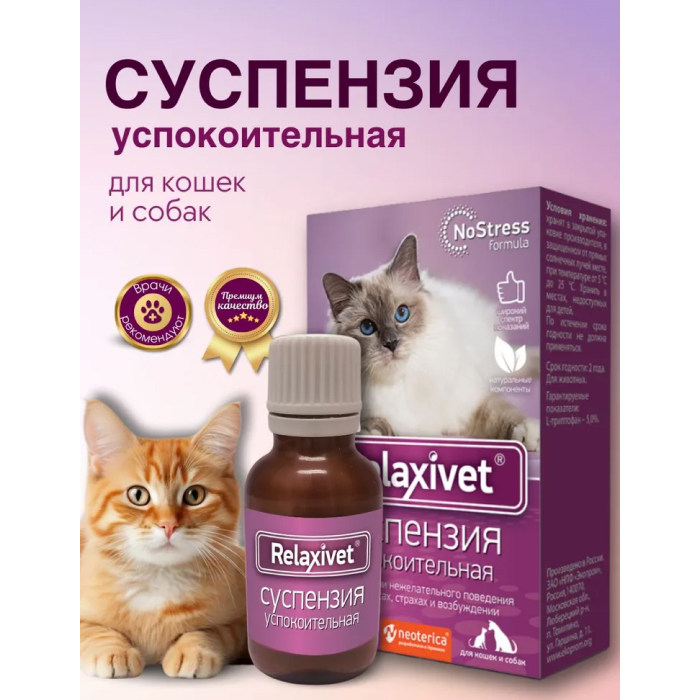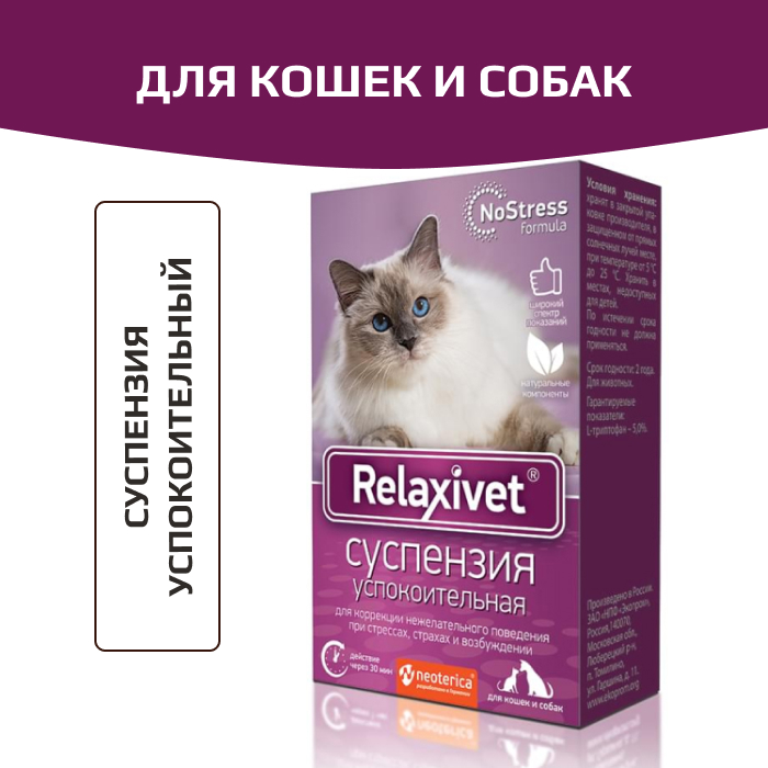 Инновационный состав! Успокоительная суспензия Relaxivet на аминокислотах — новое слово в современной ветеринарии. В отличие от традиционных препаратов, успокоительная суспензия Relaxivet предотвращает появление и развитие стресса: L-триптофан — естественный антидепрессант (предшественник серотонина, «гормона счастья»). L-триптофан снимает нервное напряжение, устраняет чувство тревоги, действует как мягкое успокаивающее средство, поднимает настроение. L-теанин — антиоксидант и природный релаксант. Напрямую влияет на психическую деятельность, уменьшая стресс, тревожность и беспокойство. Инозитол — витаминоподобное вещество: восстановливает структуры нервной ткани, ослабляет чувство страха, уменьшает проявления депрессии.