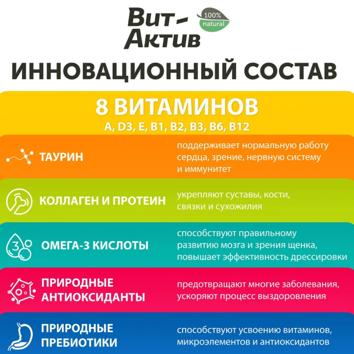 Вит-Актив - витаминно-минеральный комплекс для обеспечения физиологических потребностей щенков в витаминах, аминокислотах и минеральных веществах, обогащения рациона природными антиоксидантами и пребиотиками. Способствует активному и здоровому росту и развитию щенков. Природные антиоксиданты предотвращают многие заболевания, ускоряют процесс выздоровления. Природные пребиотики способствуют усвоению витаминов, микроэлементов и антиоксидантов.
