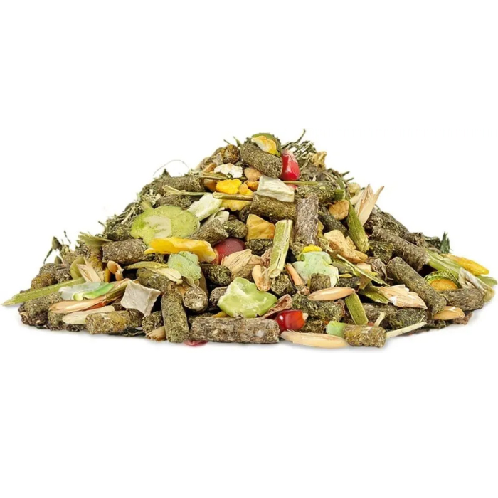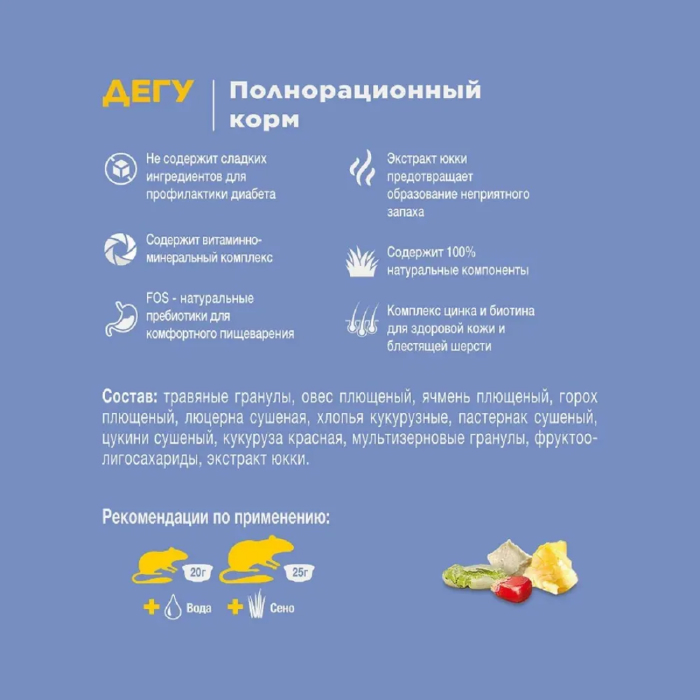 Полноценный корм с добавлением витаминов и минеральных веществ, сбалансированный в соответствии с пищевыми потребностями дегу. Рацион отличается высоким содержанием клетчатки, необходимой для правильного пищеварения дегу. Состоит из травяных гранул, плющеных зерен, сушеных овощей, сушеной люцерны, сушеного яблока и плодов рожкового дерева.