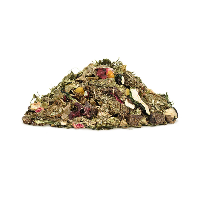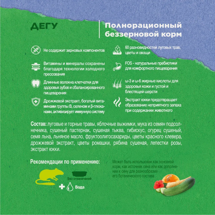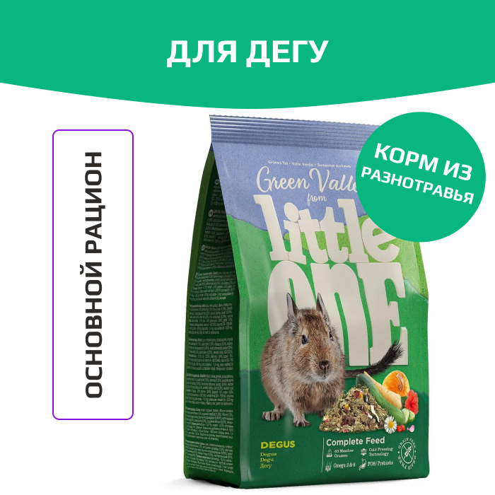 Полнорационный беззерновой корм для дегу, в состав которого входит 60 разновидностей трав. Изготовленный с помощью специальной технологии холодного прессования, корм сохранил все витамины, минералы и другие ценные питательные вещества, входящие в состав растений. Для разнообразия рациона в состав включены более 10 полезных и самых любимых дегу ингредиентов, в числе которых пастернак, гибискус, рябина и цветы ромашки. Корм богат длинными волокнами клетчатки, а также обогащен фруктоолигосахаридами для поддержания роста полезной микрофлоры в кишечнике и жирными кислотами ω-3 и ω-6 для здоровья кожи и блестящей шерсти. Кроме того в состав входит дрожжевой экстракт, богатый витаминами группы В, селеном и β-глюканами, который оказывает благотворное влияние на иммунную систему. Little One «Зеленая долина» не содержит зерновых компонентов и прекрасно подходит для диетического питания животных, в том числе страдающих от избыточного веса и других заболеваний. Не содержит красителей, ароматизаторов, ГМО.