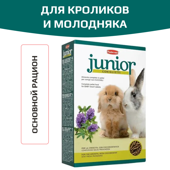 Корм в гранулах для растущих декоративных кроликов, дается в течение первых четырех/пяти месяцев жизни. Может применяться также в качестве дополнения к рациону взрослых декоративных кроликов.