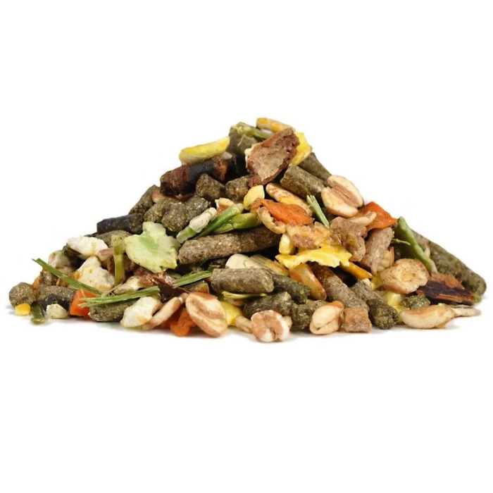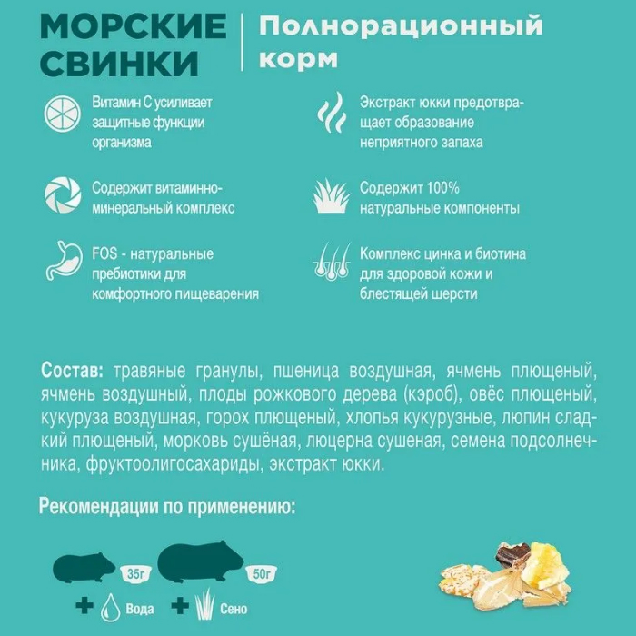 Полнорационный корм с добавлением витаминов и минеральных веществ. Разработан с учетом специфических потребностей морских свинок и содержит повышенное количество витамина С, жизненно необходимого для их здоровья. Разнообразный состав корма включает в себя травяные гранулы, воздушные ингредиенты и хлопья, семена, овощи и редкие плоды. Также корм содержит фруктоолигосахариды, комплекс биотина и цинка для здоровья кожи и блестящей шерсти, экстракт юкки для нейтрализации запаха, а также сбалансирован по размеру компонентов.