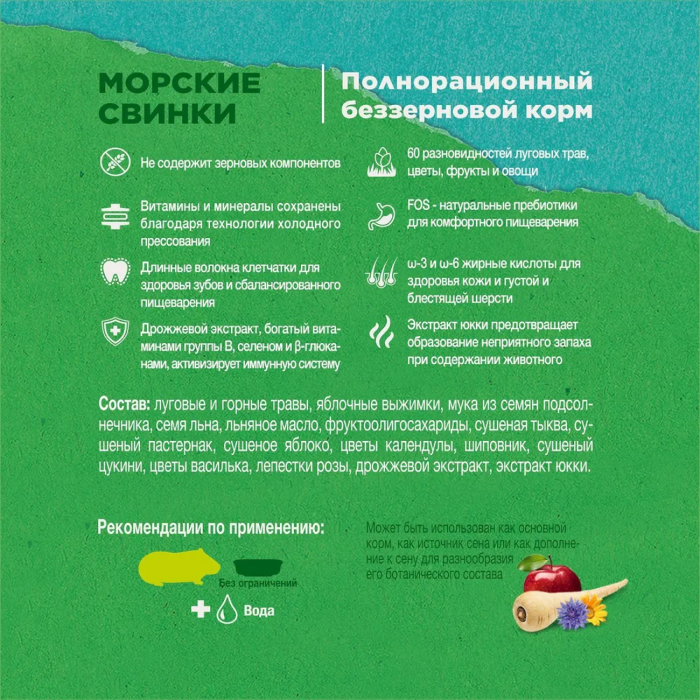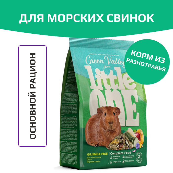 Little One «Зеленая долина». Корм из разнотравья для морских свинок - корм для декоративных животных, в состав которого входит 60 разновидностей трав. Изготовленный с помощью специальной технологии холодного прессования, корм сохранил все витамины, минералы и другие ценные питательные вещества, входящие в состав растений. Корм богат длинными волокнами клетчатки, что обеспечит необходимый уход за зубами и правильное пищеварение у свинок. Рацион обогащен фруктоолигосахаридами — натуральными пребиотиками, которые поддержат рост полезной микрофлоры в кишечнике. Жирные кислоты ω-3 и ω-6, содержащиеся в корме, обеспечат здоровье кожи и сделают шерсть питомца густой и блестящей. Дрожжевой экстракт, богатый витаминами группы В, селеном и β-глюканами, окажет благотворное влияние на иммунную систему. Для разнообразия рациона морской свинки в состав корма входят вкусные и полезные добавки — сушеные цветы, фрукты, овощи и ягоды. Не содержит зерновых компонентов, что прекрасно подходит для диетического питания животных, в том числе страдающих от избыточного веса и других заболеваний. Не содержит красителей, ароматизаторов, ГМО.
