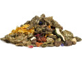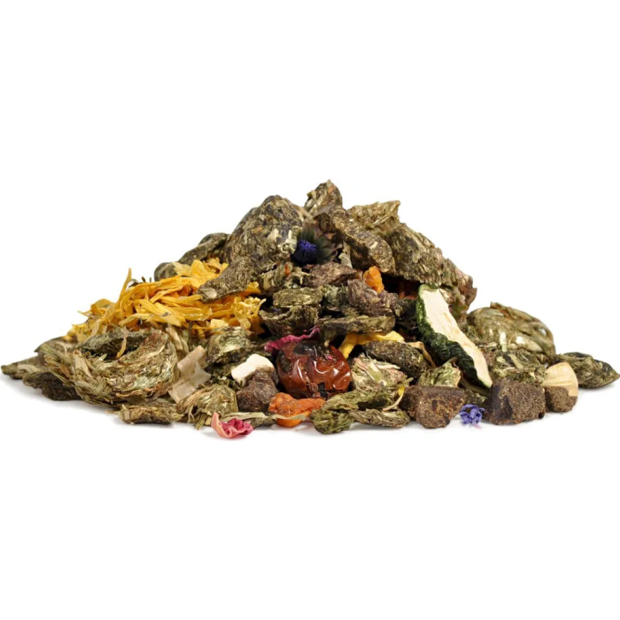 Луговые и горные травы Яблочные выжимки Мука из семян подсолнечника Семя льна Льняное масло Фруктоолигосахариды (0,9%) Сушеная тыква (1,4%) Сушеный пастернак (1,4%) Сушеное яблоко (1%) Цветы календулы (0,9%) Шиповник (0,7%) Сушеный цуккини (0,7%) Цветы василька (0,7%) Лепестки розы (0,2%) Дрожжевой экстракт (0,75%) Экстракт юкки (0,01%).