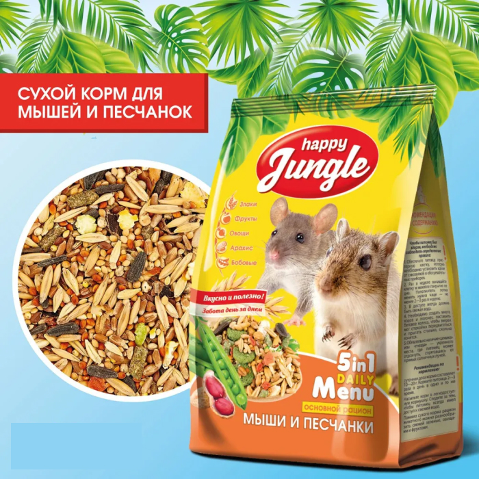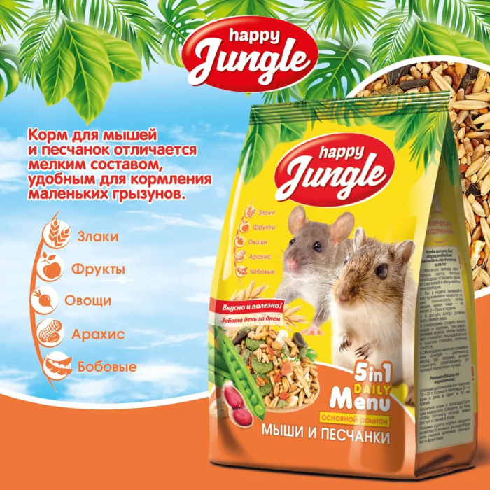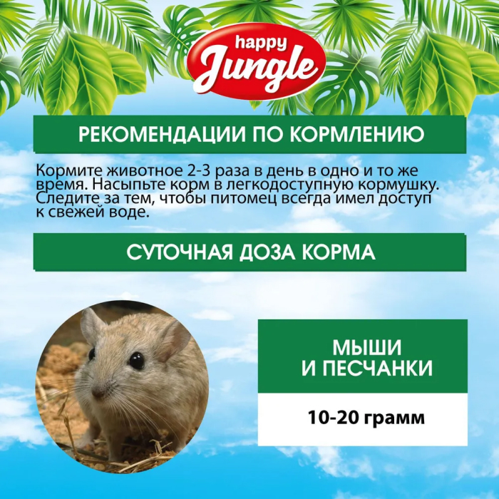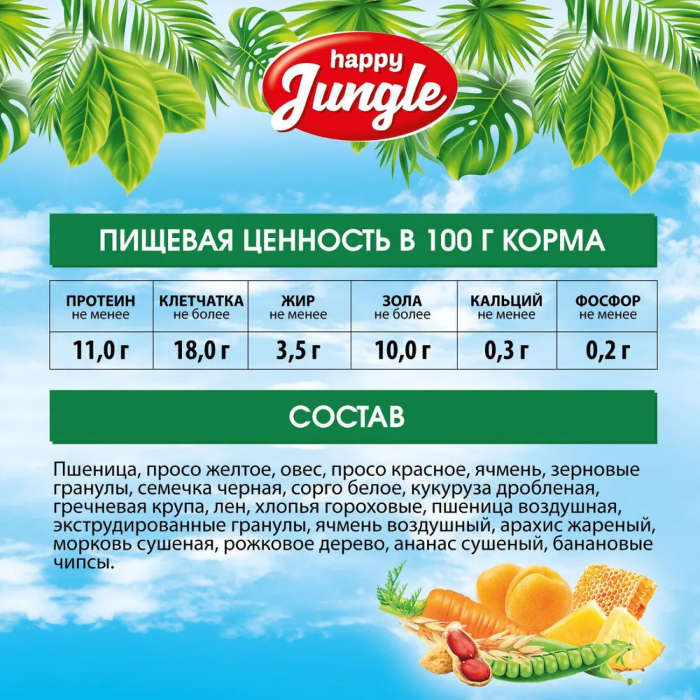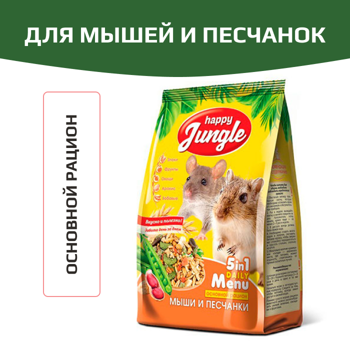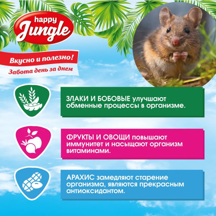 Рационы Happy Jungle сочетают в себе полезные и вкусные ингредиенты, необходимые для активной жизни питомца.