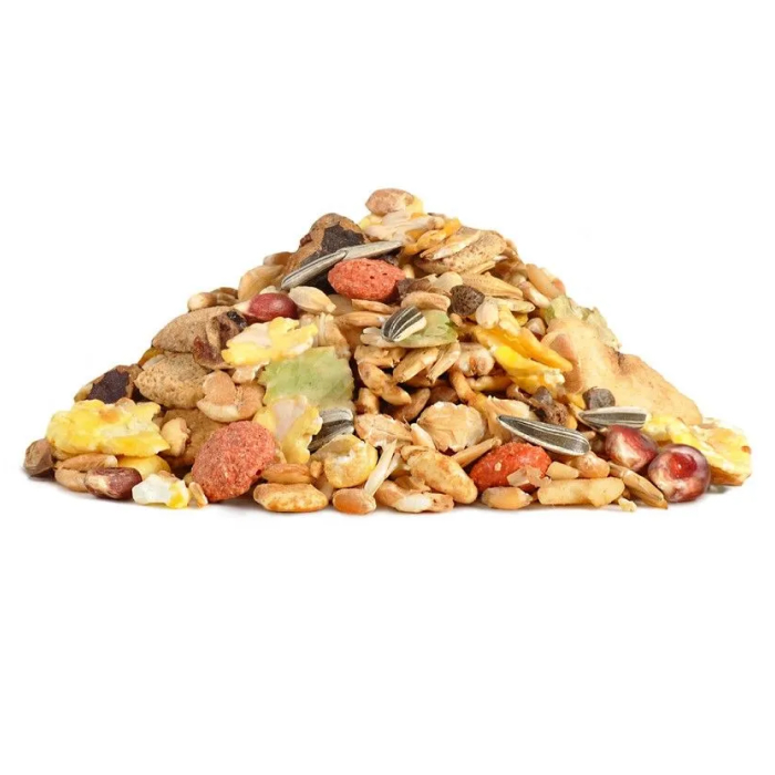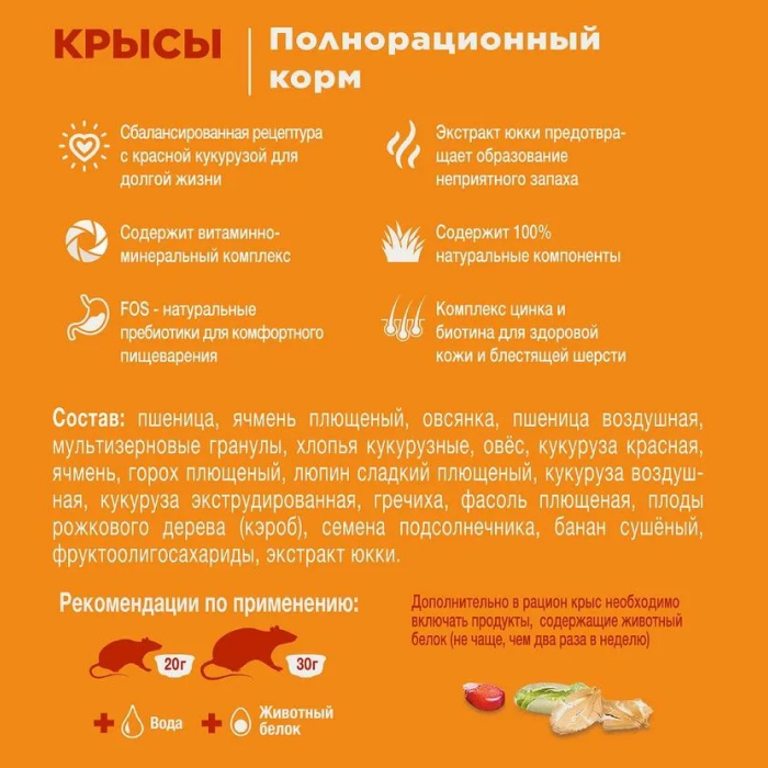 Полнорационный корм с добавлением витаминов и минеральных веществ. Имеет сбалансированный состав, включающий в себя разнообразные зерна, семена, редкие плоды, а также сушеный банан, обеспечивающий прекрасную поедаемость корма. Разработан с учетом специфических потребностей крыс и содержит красную кукурузу, благоприятно влияющую на их здоровье и долголетие. Красная кукуруза снижает вероятность возникновения и развития опухолей, нормализуется уровень сахара и холестерина в крови. В корм добавлены все необходимые витамины и минералы, комплекс биотина с цинком, фруктоолигосахариды и экстракт юкки.