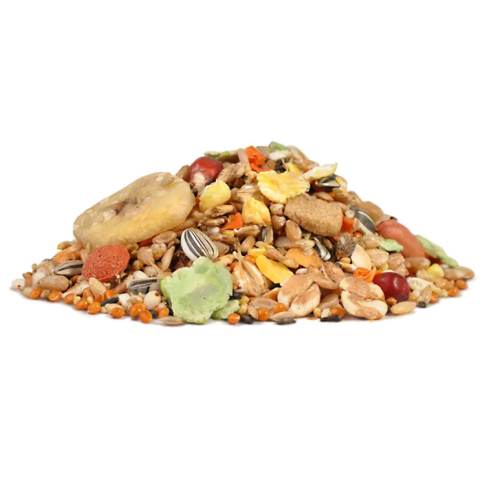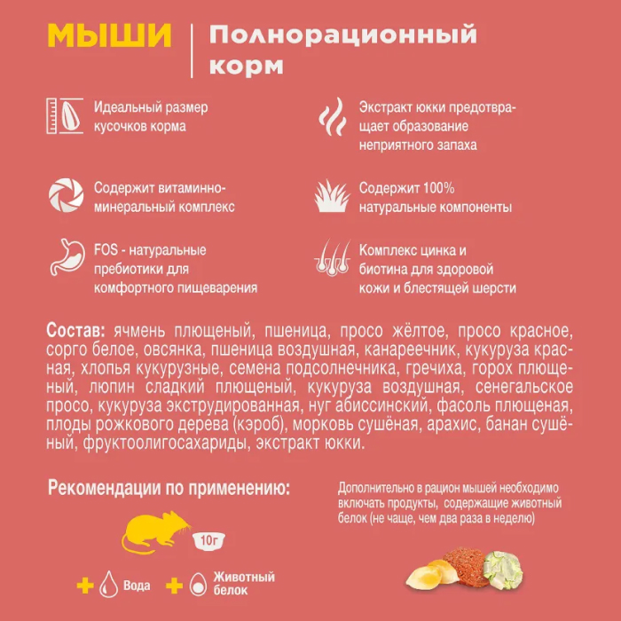 Полнорационный корм, который включает в себя более 20 тщательно подобранных по размеру компонентов. Содержит комплекс белков, жиров, углеводов, минеральных веществ и витаминов, необходимых для полноценного питания и здоровья мышей. Отличается высокой питательностью и усвояемостью. В корм добавлен абиссинский нуг, богатый белками и жирами, который служит в качестве дополнительного источника энергии. Добавлен экстракт юкки, который нейтрализует запахи, а также любимое питомцами сенегальское просо.