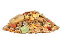 Ячмень плющеный Пшеница Просо желтое Просо красное Сорго белое Овсянка Пшеница воздушная Канареечник Кукуруза красная Хлопья кукурузные Семена подсолнечника Гречиха Горох плющеный Люпин сладкий плющеный Кукуруза воздушная Сенегальское просо (2%) Кукуруза экструдированная Нуг абиссинский Фасоль плющеная Плоды рожкового дерева (кэроб) Морковь сушеная Арахис Полезные семена Банан сушеный Фруктоолигосахариды (0,3%) Экстракт юкки (0,01%).