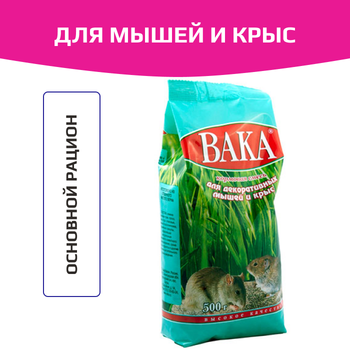 Вака Высокое Качество корм для мышей и крыс - многокомпонентный корм для крыс и мышей. Корм "ВАКА" разработан при участии ведущих специалистов в области разведения декоративных крыс и мышей и обладает уникальным составом, включающим в себя не только полноценный повседневный рацион, но и дополнительные компоненты, необходимые вашему любимцу.