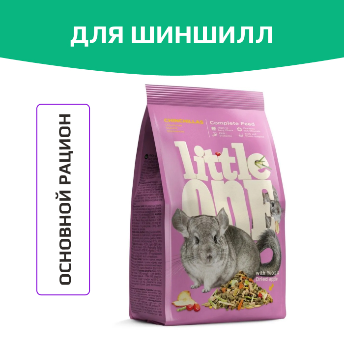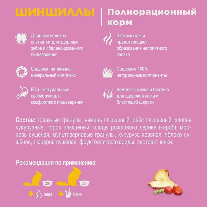 Полнорационный корм с добавлением витаминов и минеральных веществ. Имеет сбалансированный состав, включающий в себя любимые шиншиллами компоненты: травяные гранулы, плющеные зерна, сушеные овощи и люцерну, плоды рожкового дерева, аппетитное сушеное яблоко. Также, содержит зёрна красной кукурузы, которые являются сильными антиоксидантами, и снижают вероятность возникновения и развития опухолей и нормализуют уровень сахара и холестерина в крови. Диетический корм для шиншилл содержит добавку витаминов и минералов, пробиотики для пищеварения (фруктоолигосахариды), комплекс биотина и цинка для шерсти и кожи, а также экстракт юкки, который нейтрализует неприятные запахи.