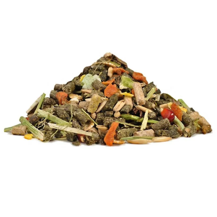 Травяные гранулы Ячмень плющеный Овес плющеный Хлопья кукурузные Горох плющеный Плоды рожкового дерева (кэроб) Морковь сушеная Мультизерновые гранулы Кукуруза красная Яблоко сушеное (1,5%) Люцерна сушеная Фруктоолигосахариды (1,5%) Экстракт юкки (0,01%).