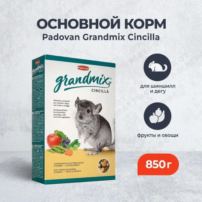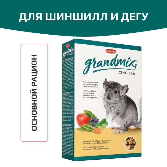 Основной корм для морских свинок, шиншилл и дегу Padovan Grandmix Cavia Cincilla содержит только природные ингредиенты. При изготовлении использовались технологии, сохраняющие полезные вещества. Состав скомпонован по рекомендациям ветеринаров. Все компоненты выращены в экологически чистых регионах.