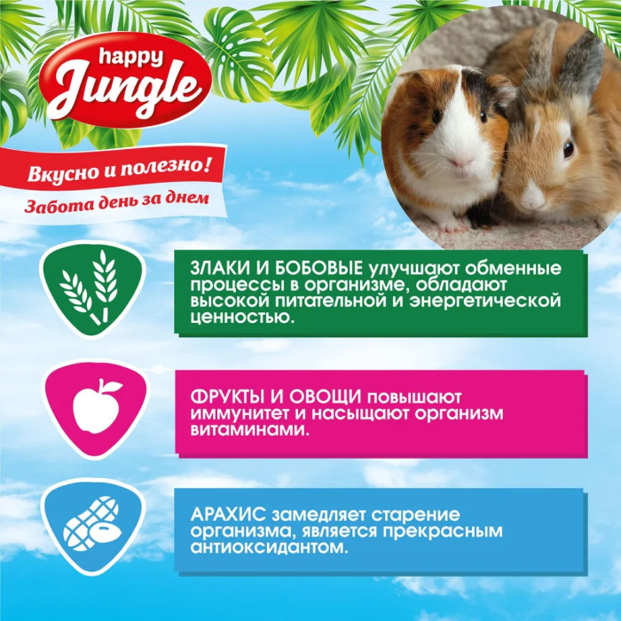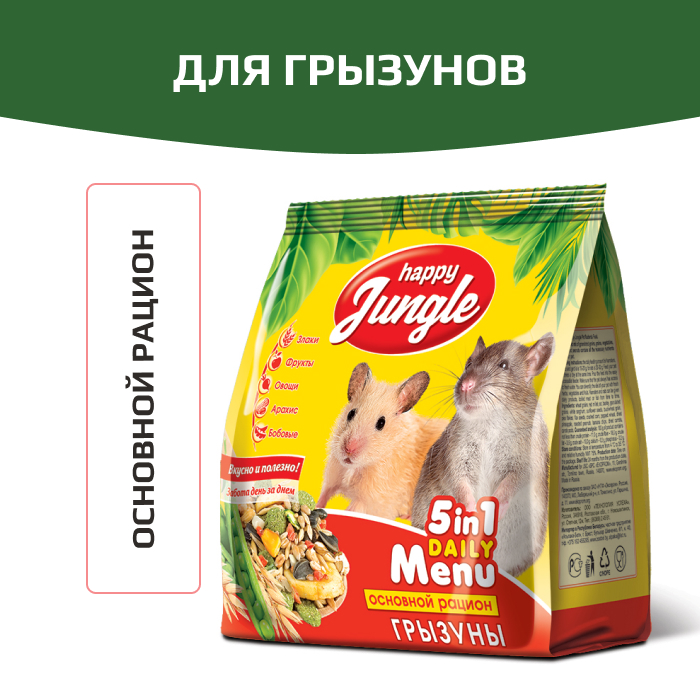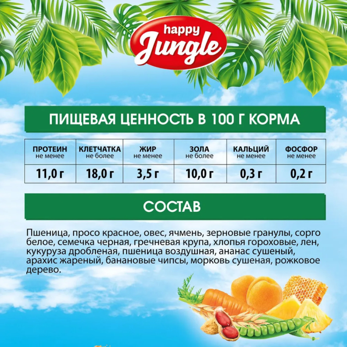 Рационы Happy Jungle сочетают в себе полезные и вкусные ингредиенты, необходимые для активной жизни питомца.