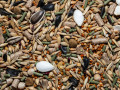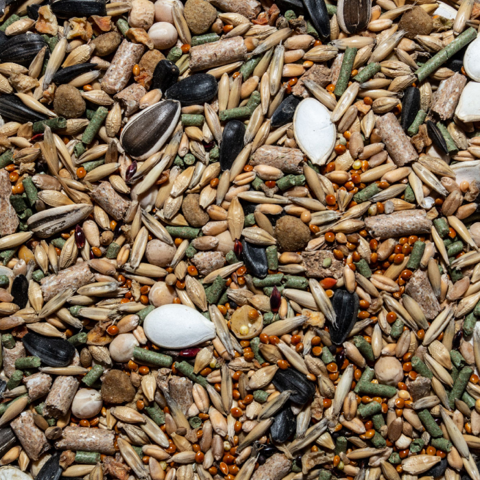 Семена луговых трав, просо, овес, пшеница, семена подсолнечника, травяные гранулы, сухие овощи и фрукты другие добавки растительного происхождения.