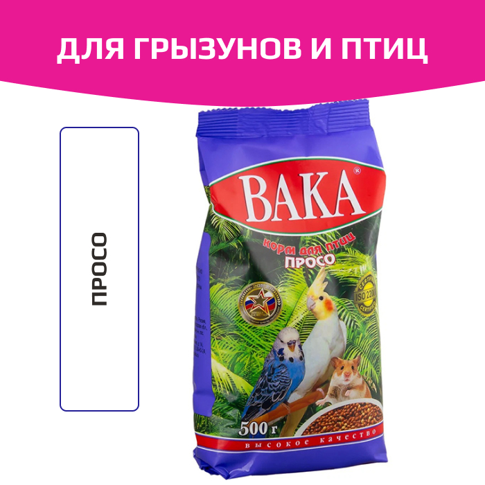 Корм Вака Просо для всех растительноядных птиц: попугаев, амадин, канареек, щеглов, снегирей и других видов декоративных птиц, а также мелких грызунов. Просо - жизненно необходимый компонент для всех попугаев, амадин и грызунов. Является незаменимым компонентом во всех зерновых смесях. Просо - жизненно необходимый компонент для всех попугаев и амадин. Богато витаминами и аминокислотами.
