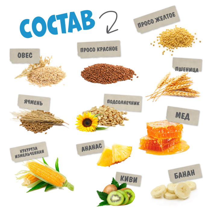 просо жёлтое просо красное пшеница ячмень подсолнечник кукуруза измельчённая мёд тропические фрукты (банан, киви, ананас) овёс