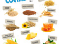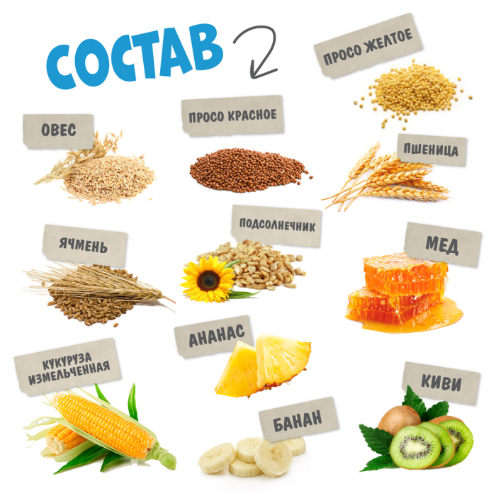 просо жёлтое просо красное пшеница ячмень подсолнечник кукуруза измельчённая мёд тропические фрукты (банан, киви, ананас) овёс