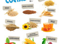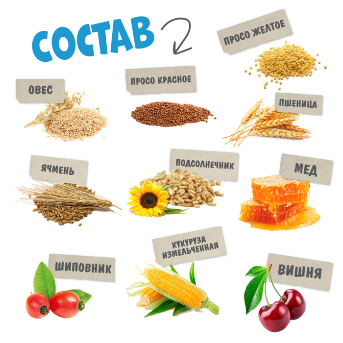 просо жёлтое просо красное пшеница ячмень подсолнечник кукуруза измельчённая мёд ягоды (вишня, шиповник) овёс овёс