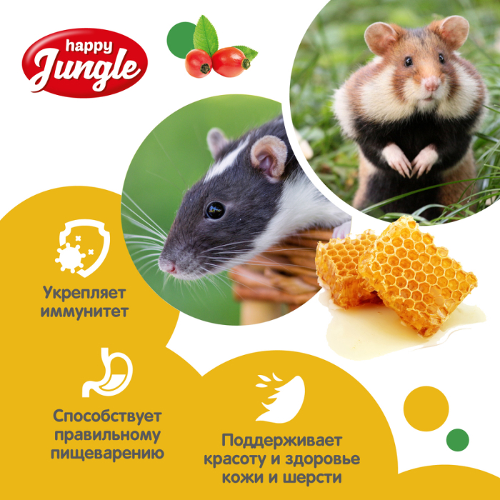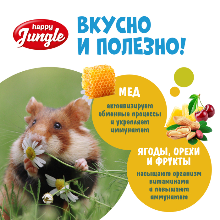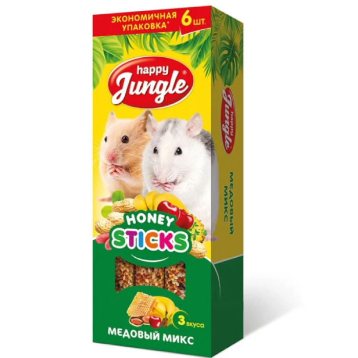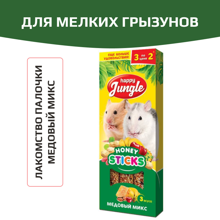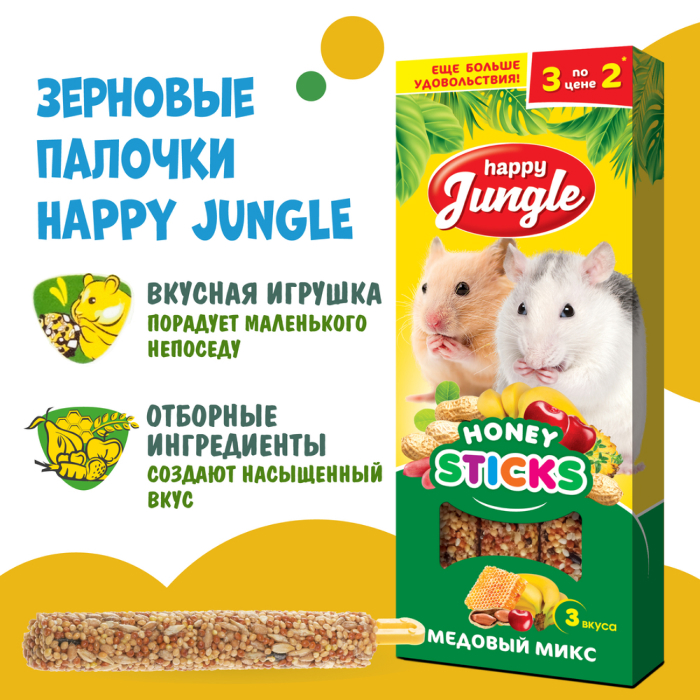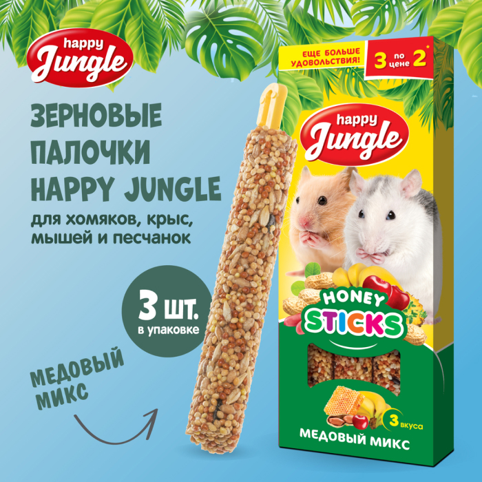 Зерновые палочки Happy Jungle - медовое лакомство для хомяков, крыс, мышей и песчанок с ягодами, орехами и тропическими фруктами 3 разных вкуса максимально разнообразят рацион, а также помогут определиться в предпочтениях грызуна.
