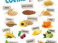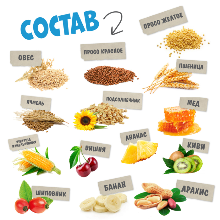 просо жёлтое, просо красное, пшеница, ячмень, овёс, подсолнечник, кукуруза измельчённая, мёд, ягоды (вишня, шиповник), орех (арахис), тропические фрукты (банан, киви, ананас).