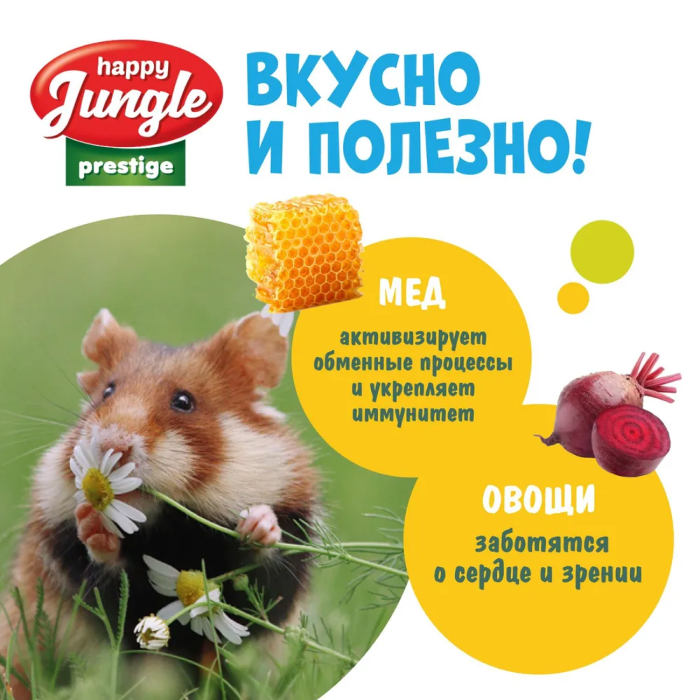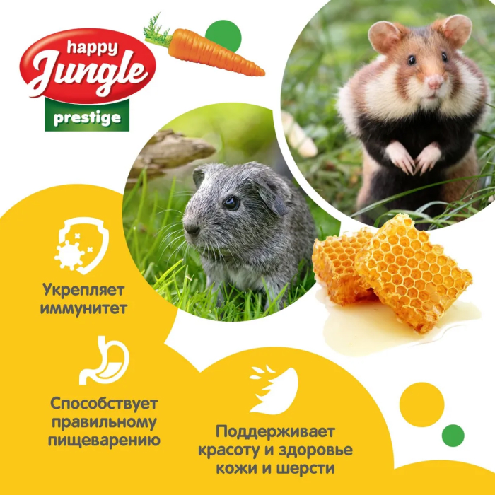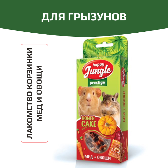 Лакомство Happy Jungle Престиж корзинки для грызунов мед+овощи сочетают в себе полезные и вкусные ингредиенты, необходимые для активной жизни питомца.