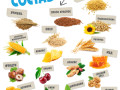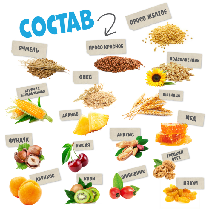 Просо желтое, просо красное, пшеница, ячмень, овес, подсолнечник, кукуруза измельченная, мед, вишня, шиповник, изюм, арахис, фундук, грецкий орех, абрикос. Ананас, киви.