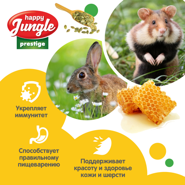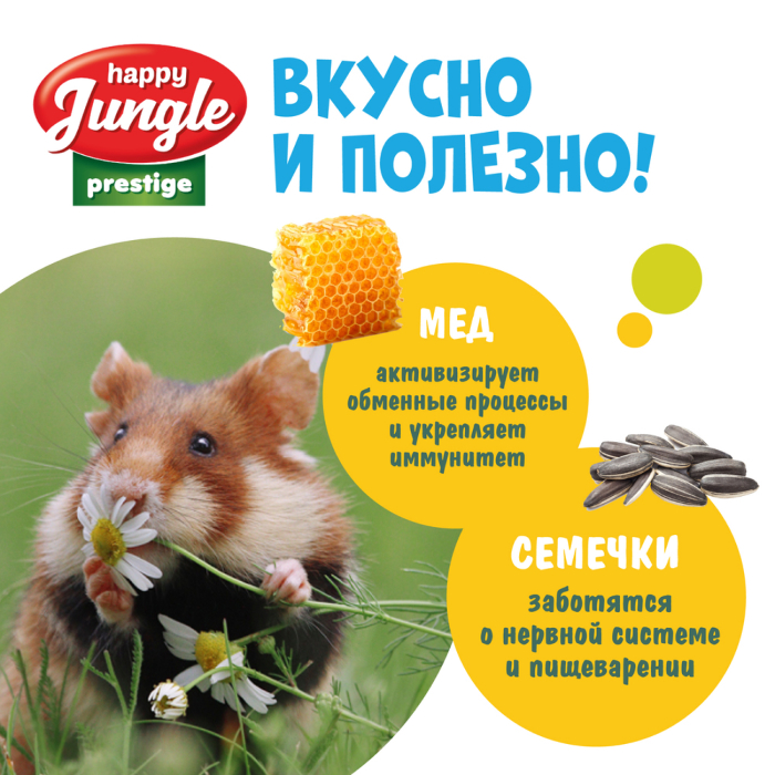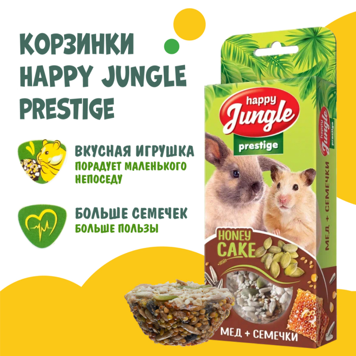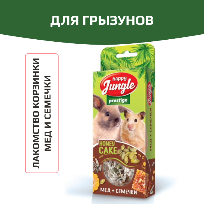 Лакомство Happy Jungle Престиж корзинки для грызунов мед+семечки сочетают в себе полезные и вкусные ингредиенты, необходимые для активной жизни питомца.